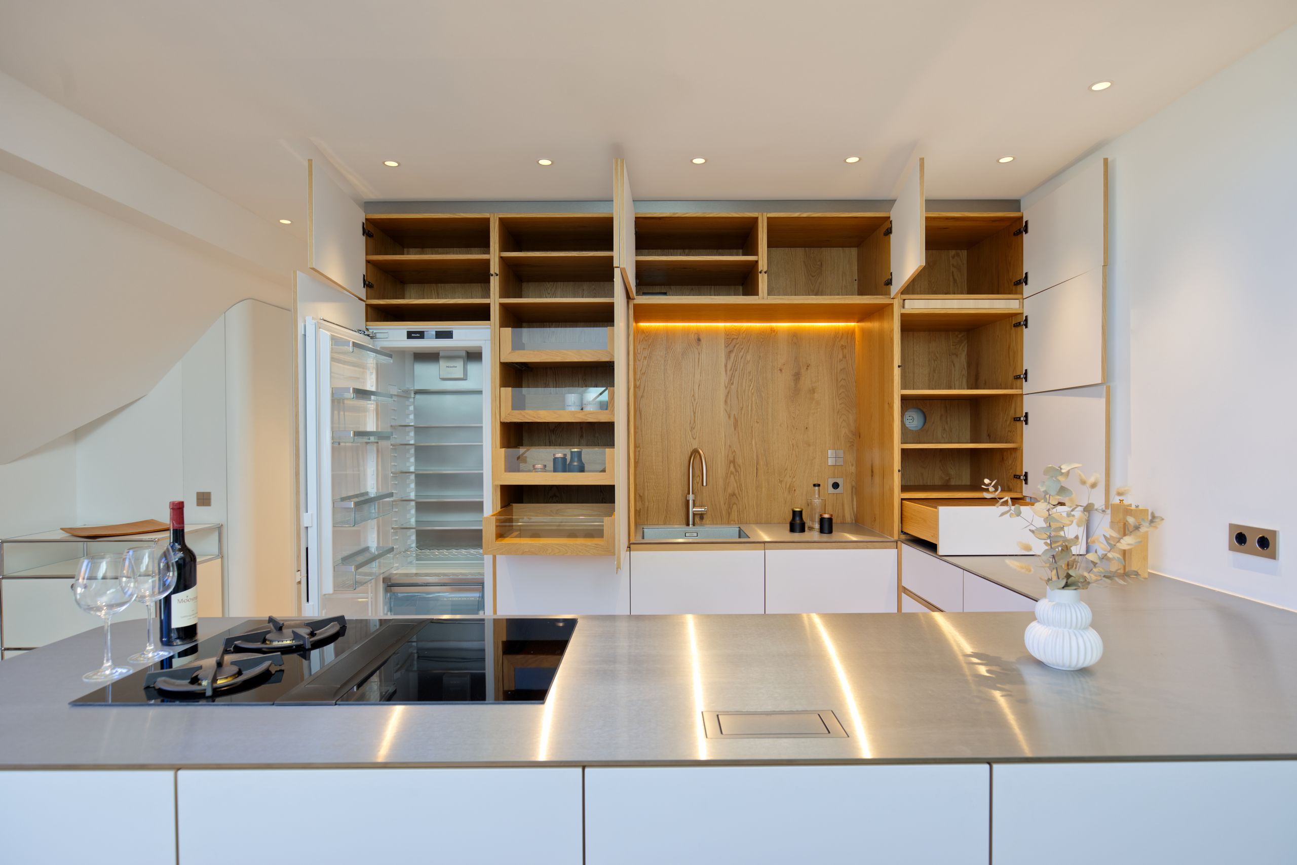 Ein besonderes Highlight ist die 8 mm starke Arbeitsplatte aus massivem Edelstahl – robust, pflegeleicht und ein stilistisches Statement. Die hochwertigen Geräte von BORA und Miele fügen sich nahtlos ins Gesamtkonzept ein und verschwinden dezent hinter der klaren Gestaltung. Ergänzt wird die Ausstattung durch einen Quooker und ein Blanco Claron Unterbauspülbecken, die Komfort und Eleganz vereinen.