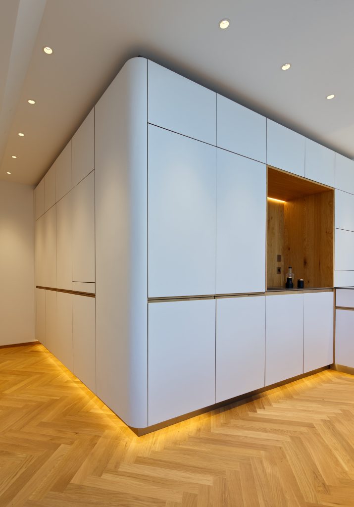 Die Fronten erstrahlen in elegantem Alpinweiß und werden von feinen Eiche-Einleimern eingefasst. Eingefräste Griffmulden sorgen für ein ruhiges, modernes Erscheinungsbild ohne störende Griffe. Abgerundete Ecken verleihen der Küche eine natürliche Formensprache und schaffen weiche Übergänge, die perfekt zur Architektur der Wohnung passen.