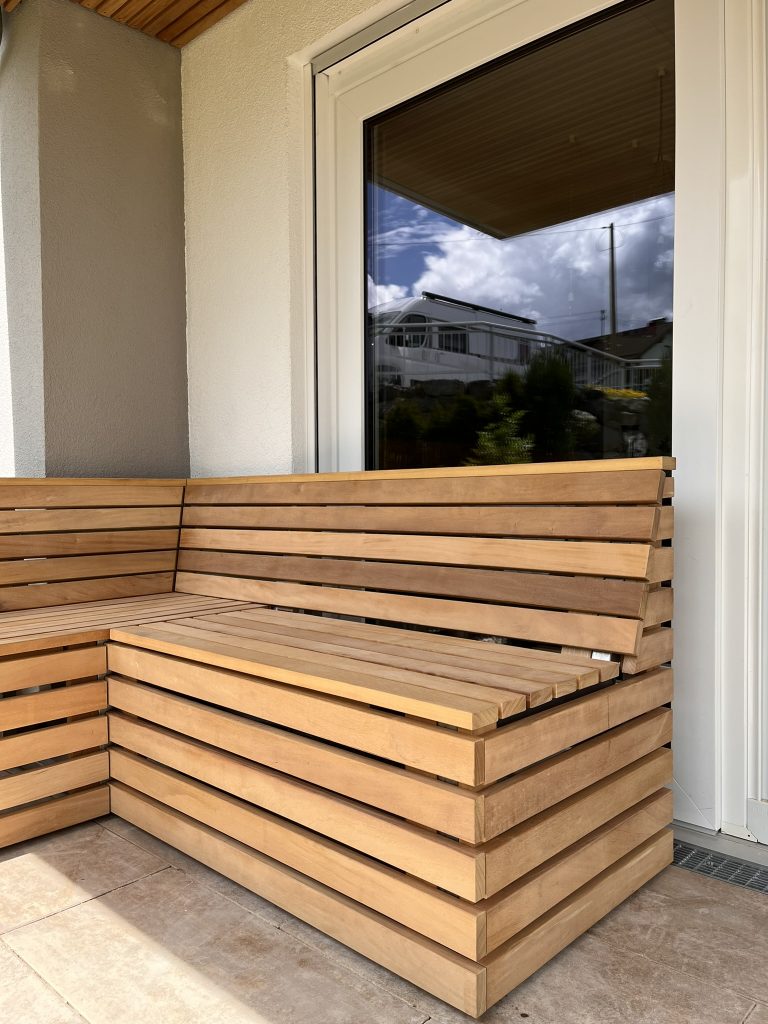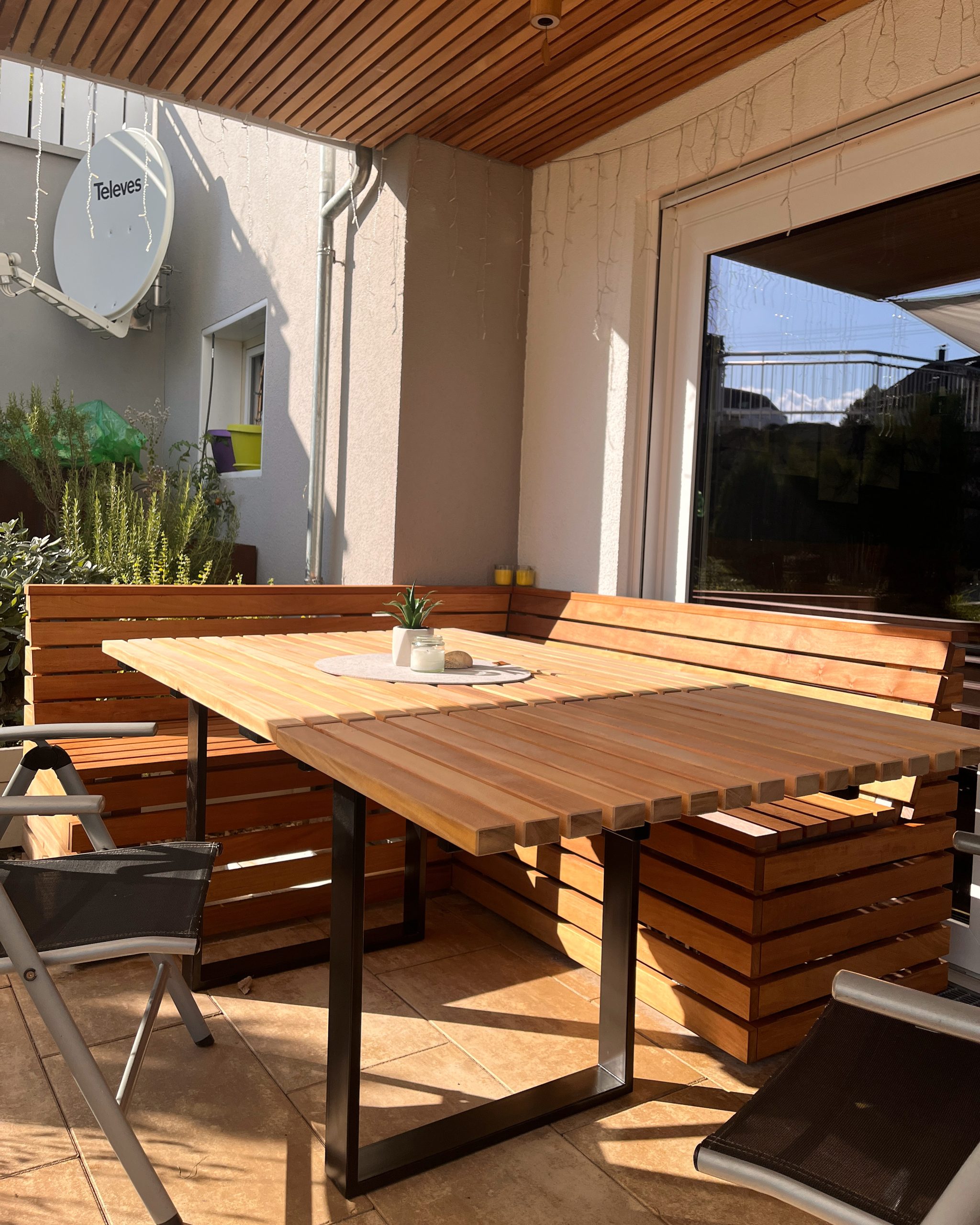 Für eine junge Familie haben wir eine Außeneckbank aus Garapa-Holz entworfen, die in stilvoller Lamellenoptik daherkommt. Diese Wahl sorgt dafür, dass die Bank nicht zu massiv wirkt und sich dennoch harmonisch in den Außenbereich einfügt. Als Grundlage für die Bank haben wir eine robuste Edelstahl-Unterkonstruktion gewählt, die mit ihrem nachhaltigen Design dafür sorgt, dass die Bank lange hält und gegen Rost beständig ist. Die Kunden waren so begeistert von der Eckbank, dass sie sich prompt einen passenden Tisch wünschen – ein Möbelstück, das die gemütliche Sitzecke auf der Terrasse perfekt ergänzt und dazu einlädt, laue Sommerabende mit Freunden zu genießen.